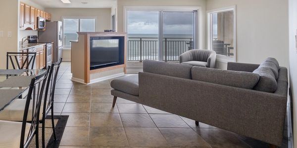 You will love the distinctive layout of this bright, comfortably sized kitchen. Great views of the ocean out the large picture window and there's even access to the balcony through a large sliding door. The coffee maker features both drip and Keurig brewing methods. The cabinets are stocked with all the stemware, dishware, utensils, pots and pans you could need to prepare a gourmet meal.